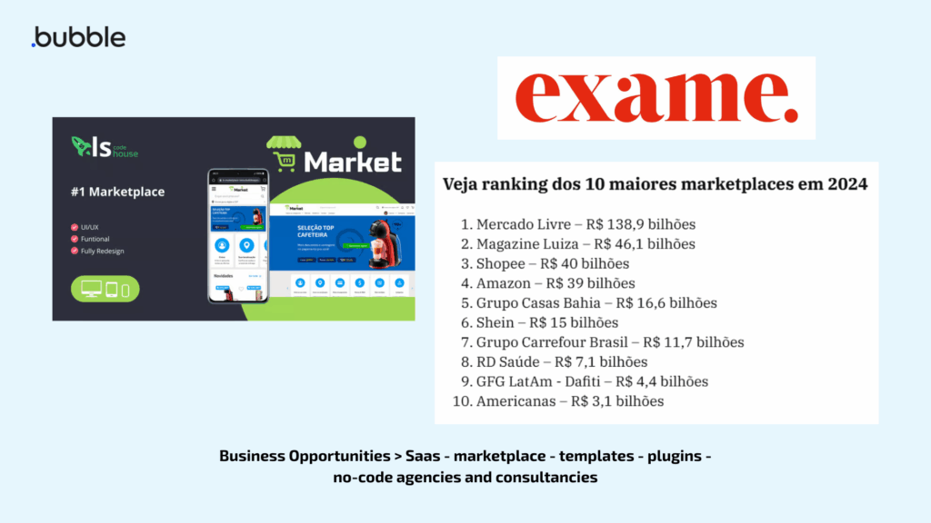 soluções como Bubble.io serão padrão para MVPs, SaaS e marketplaces.